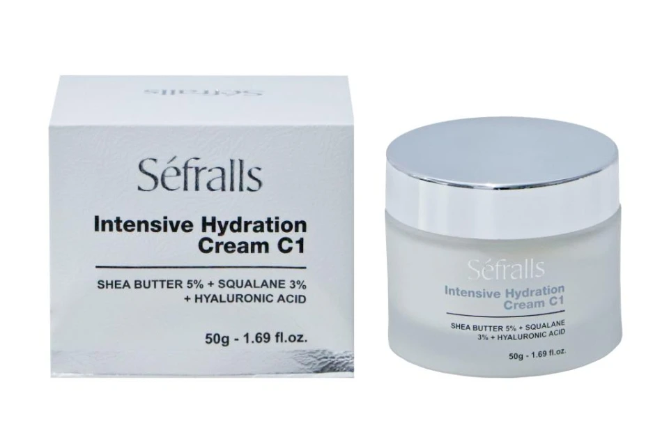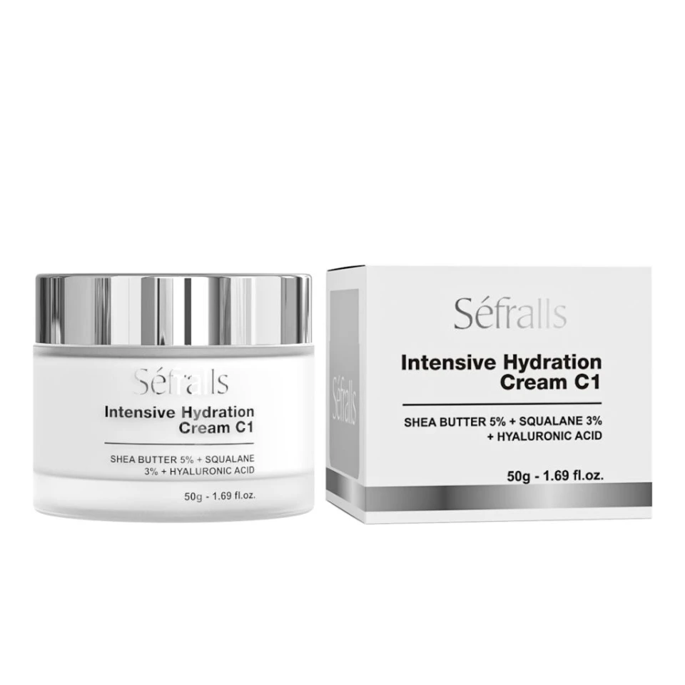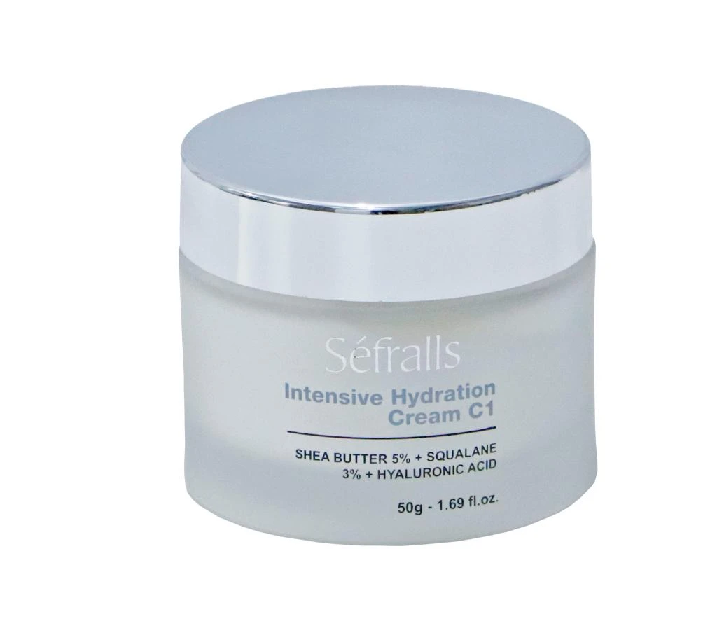 - Séfralls Intensive Hydration Cream C1 es una crema hidratante facial que contiene manteca de karité (5%), escualano (3%) y ácido hialurónico.