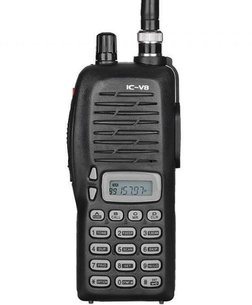 - Radio HT VHF Icom IC-V8, cuenta con pantalla de cristal líquido (LCD) con retroiluminación, permite ingresar la frecuencia directamente en el teclado.