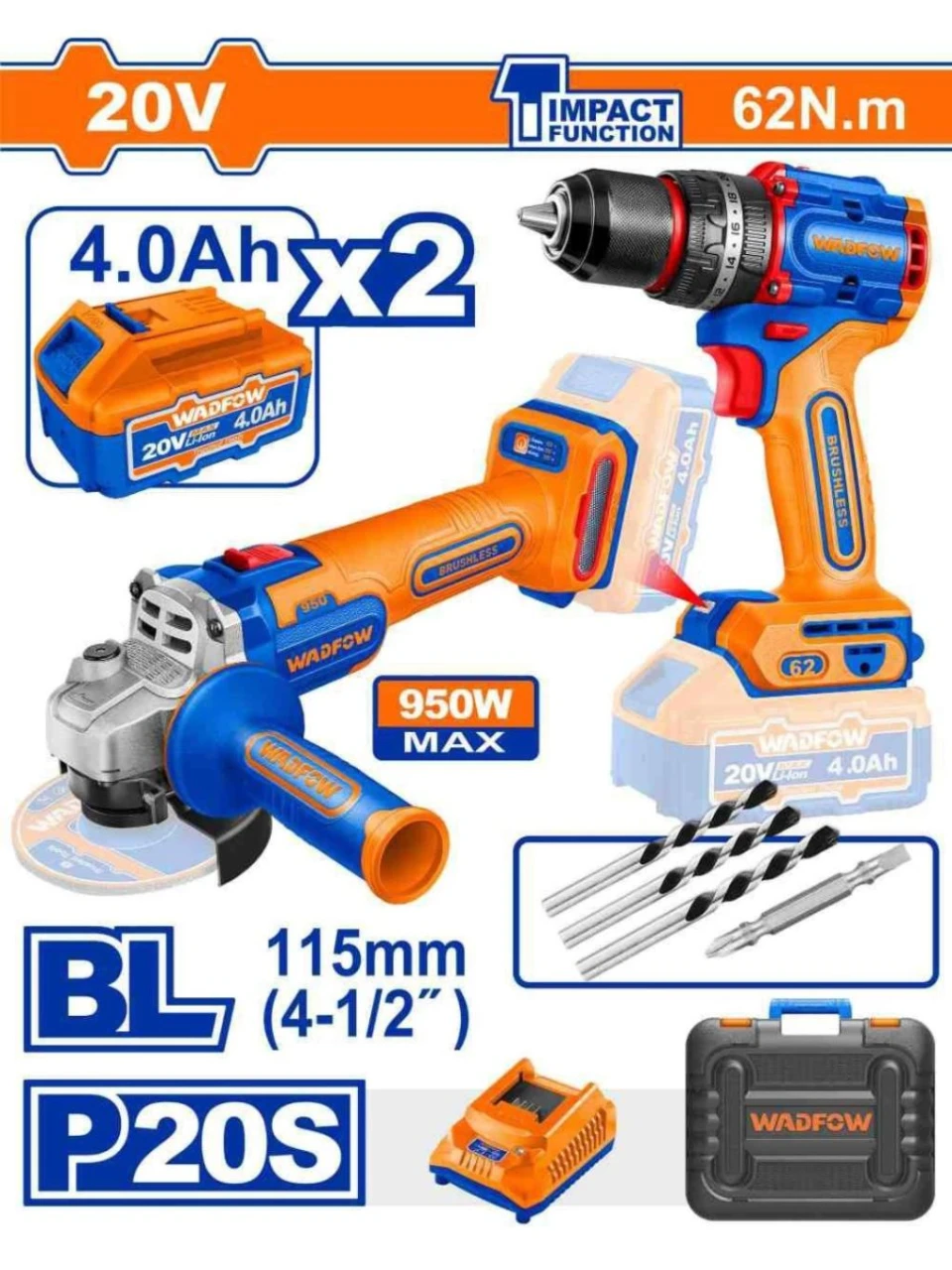 WADFOW COMBO 2PCS AMOLADORA +TALADRO 20V WCK20273